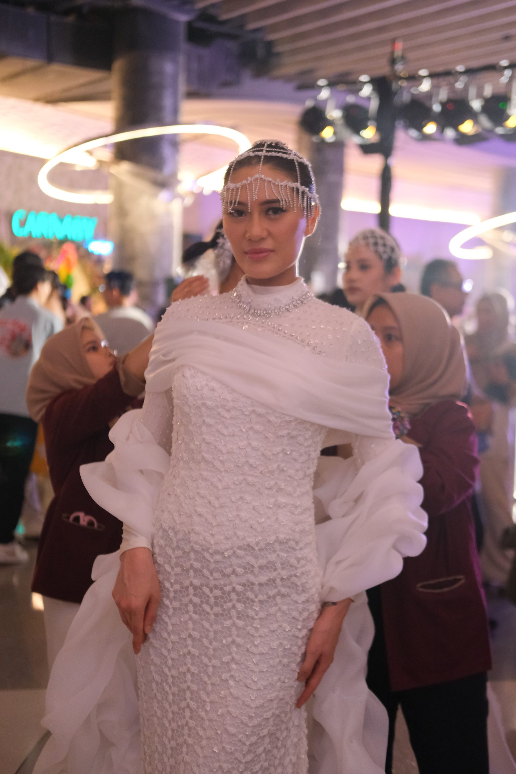 Jannet Dress adalah busana berwarna putih yang memadukan keanggunan klasik dengan sentuhan modern dan mewah. Dress ini dipercantik dengan lapisan payet putih berkilau yang disusun rapi, menghasilkan nuansa elegan yang memantulkan cahaya secara halus di setiap gerakan. Taburan permata di bagian leher menambahkan detail yang memikat, menghadirkan kesan glamor tanpa berlebihan.