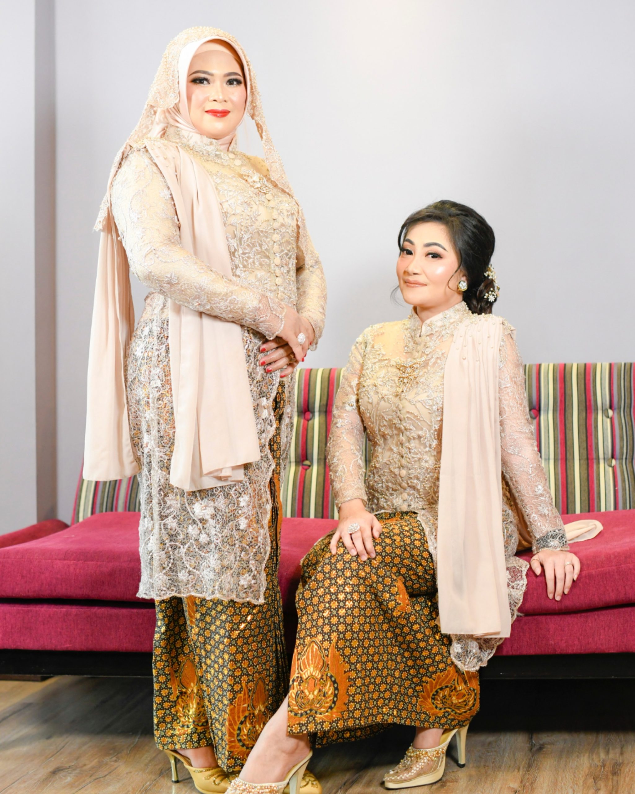 Hadir dengan dominasi warna nude yang lembut dipadukan sentuhan rose gold berkilau, kebaya ini memancarkan aura anggun sekaligus mewah. Detail payet bernuansa nude disusun dengan rapi di setiap sisi, menambah kesan berkelas namun tetap elegan saat dikenakan. Kebaya ini sangat fleksibel untuk dipadukan dengan beskap Jawa maupun basofi dalam warna senada, menciptakan keselarasan yang indah antara tradisi dan modernitas. Hadir bukan hanya sebagai busana, tetapi sebagai simbol keanggunan seorang ibu di momen berharga, yang selalu ingin tampil istimewa namun tetap selaras dengan keseluruhan konsep acara.
